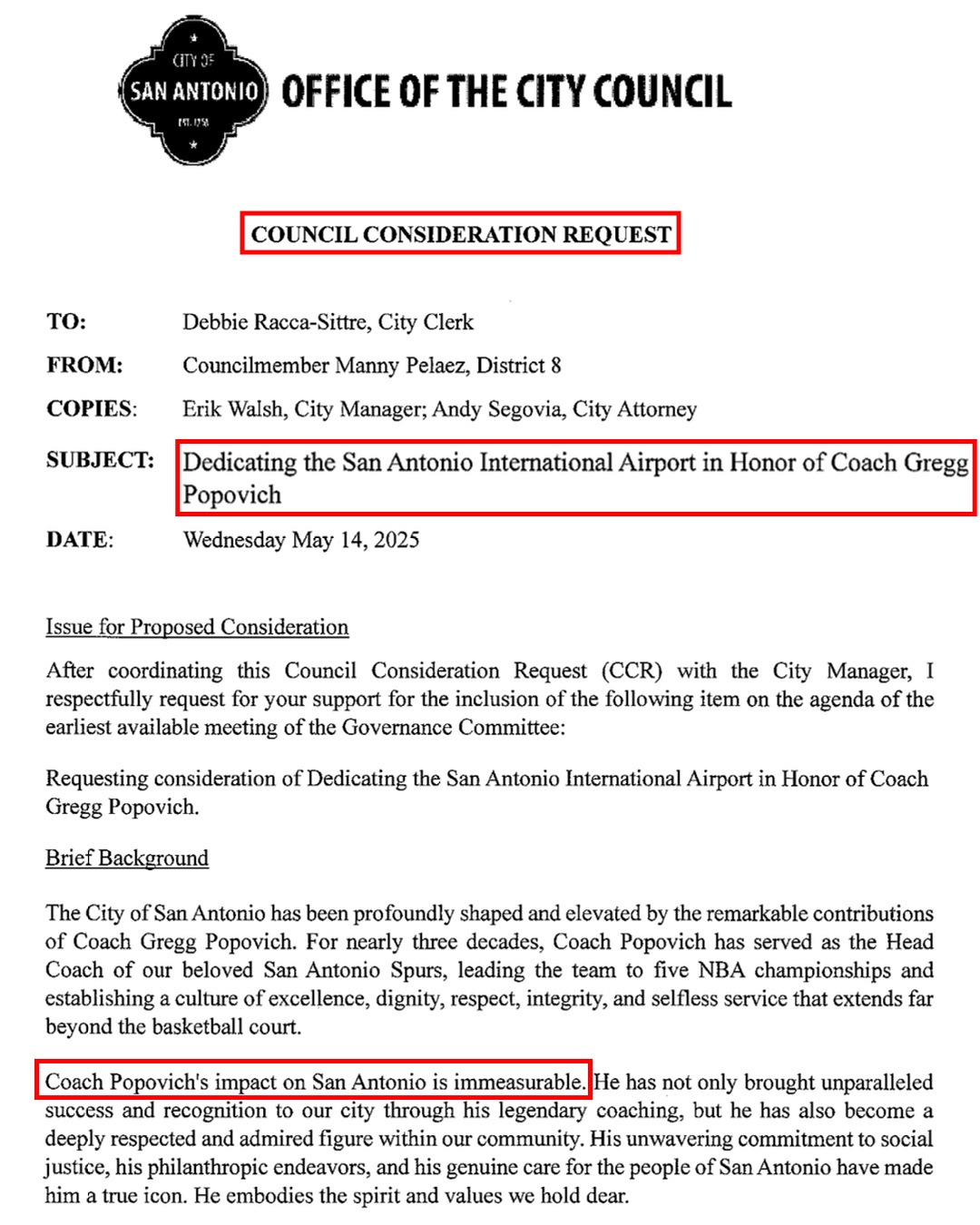 05月17日讯 一位圣安东尼奥议员正式发起提议,要求用马刺总裁&前主帅格雷格-波波维奇的名字命名圣城机场。
