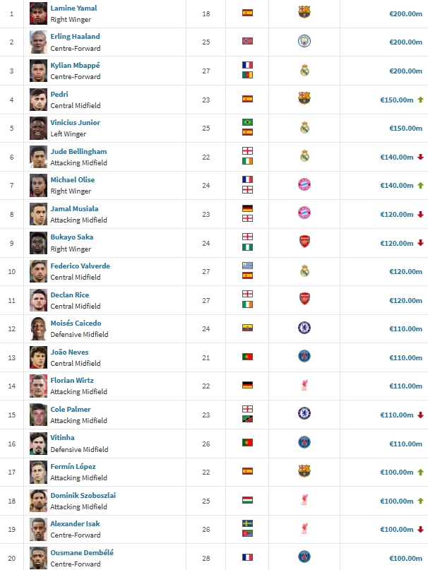03月27日讯 今日德转更新法甲球员身价,至此本月五大联赛球员身价已经全部完成更新,目前足坛共有20个人身价达到或超过1亿欧元,具体球员如下,费尔明、索博涨至1亿欧元,阿尔瓦雷斯从1亿跌至9000万。